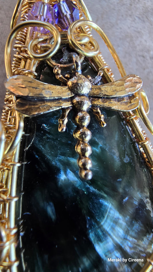 Seraph - Dragon Fly Seraphinite Woven Gold Tone Copper Pendant