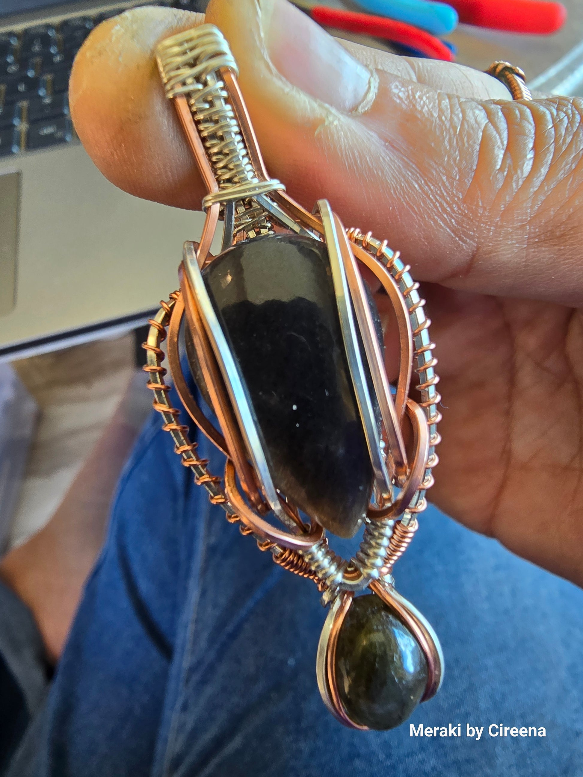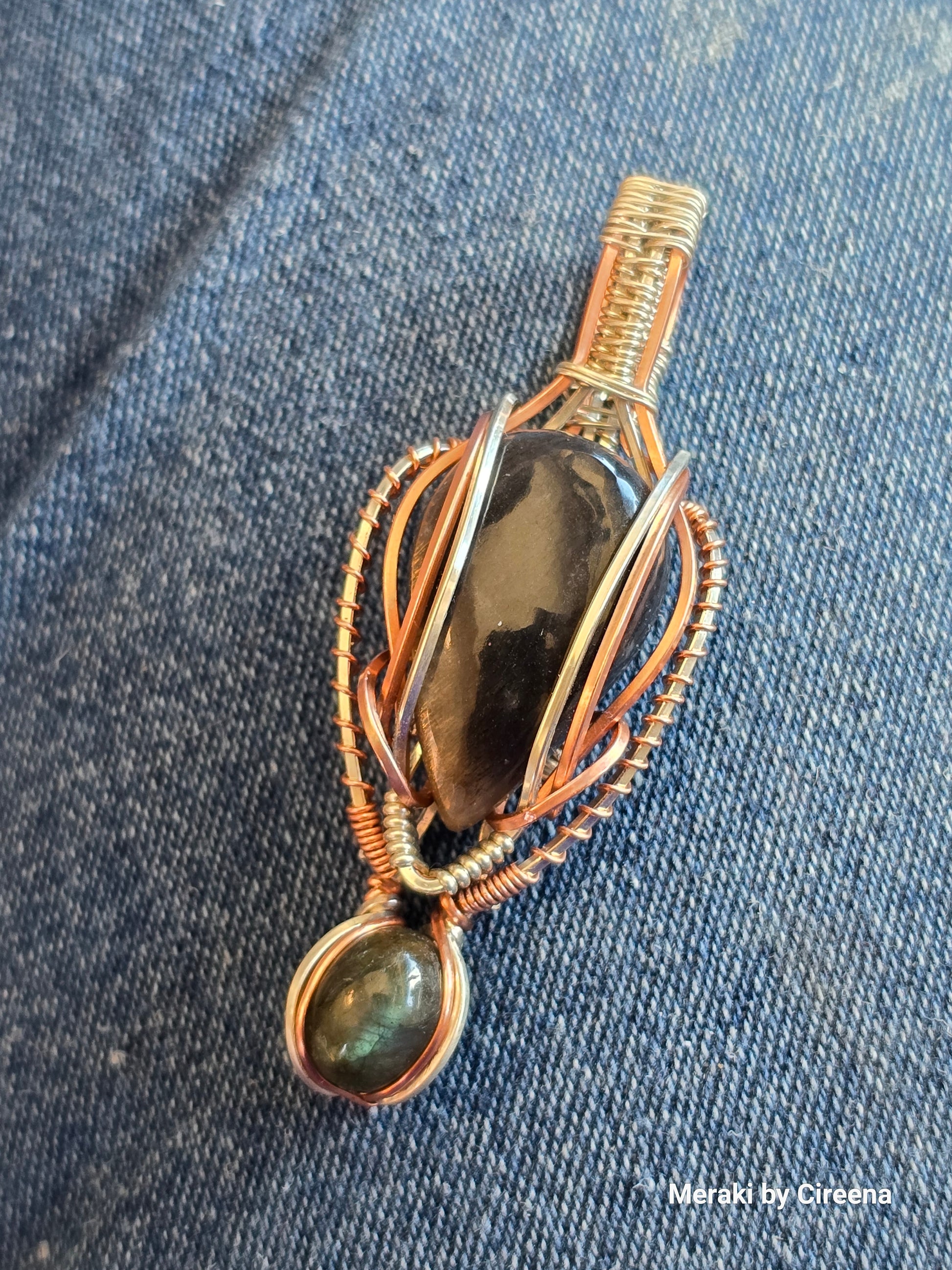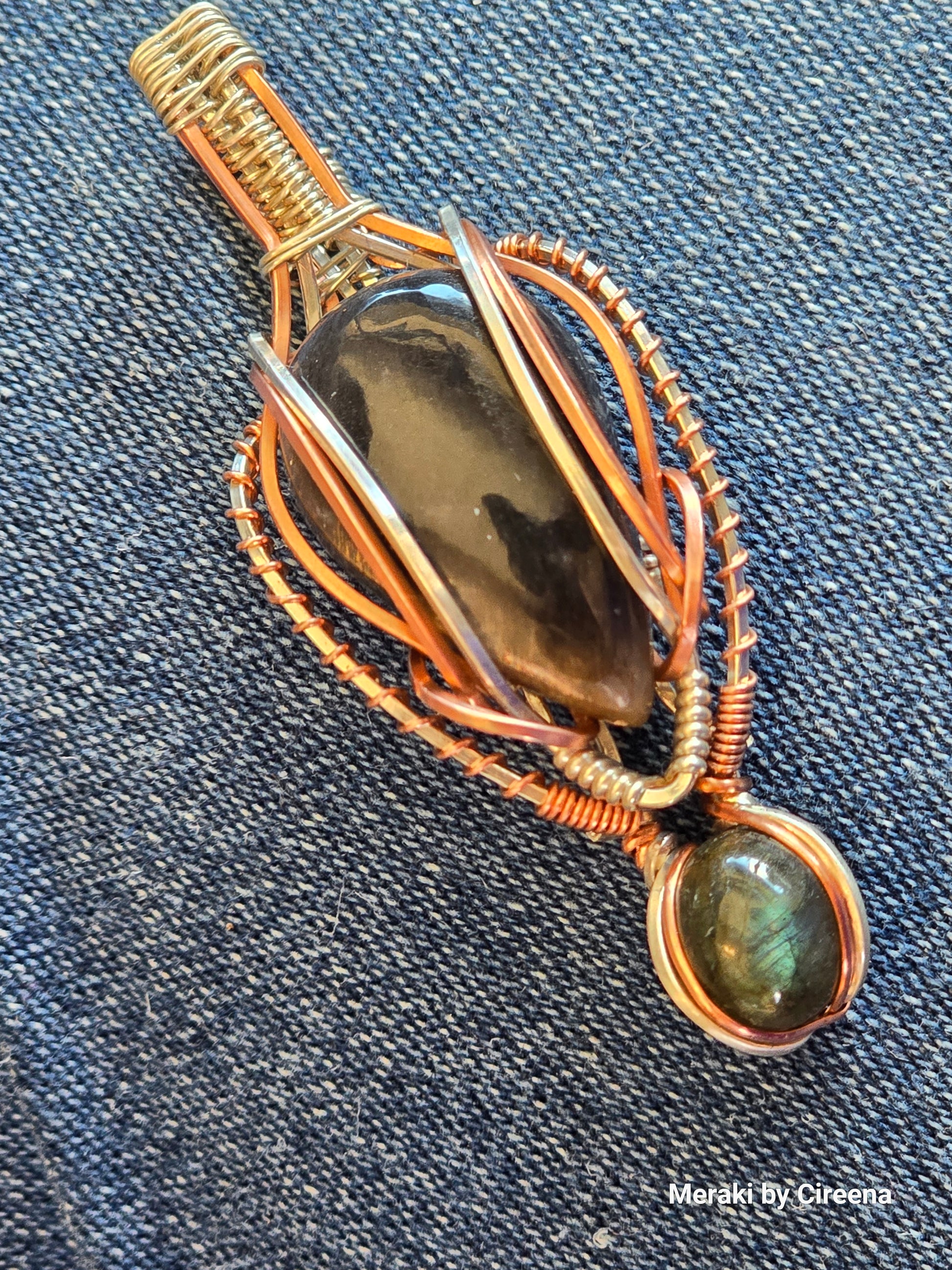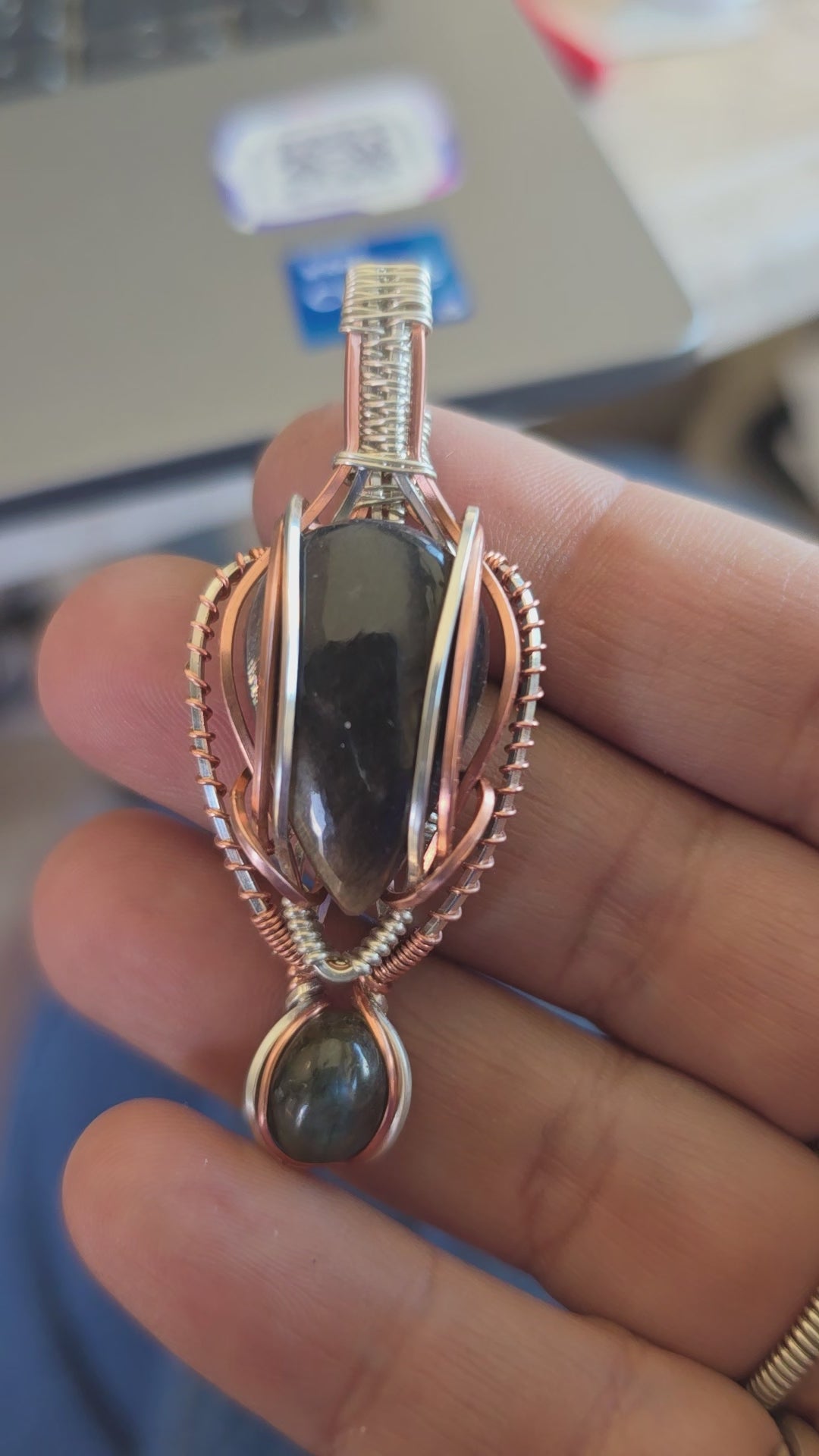 Sparkle with celestial beauty wearing our "Eclipse of the Sun"stone Silver & Copper Pendant. Handcrafted in copper and sterling silver, this pendant features stunning black Rainbow Sunstone and Labradorite gemstones. Radiate elegance and charm with this unique blend of metals and gemstones.