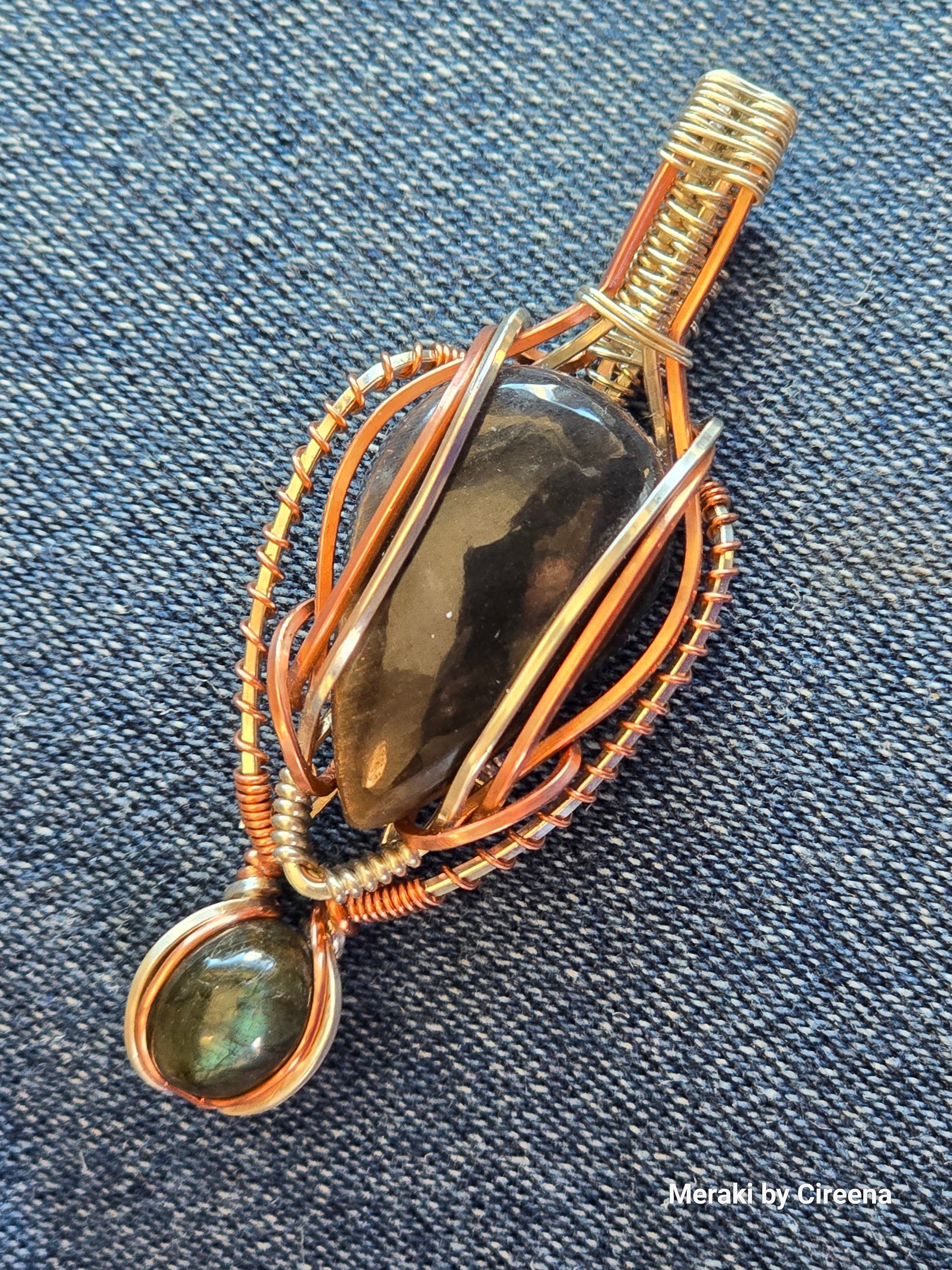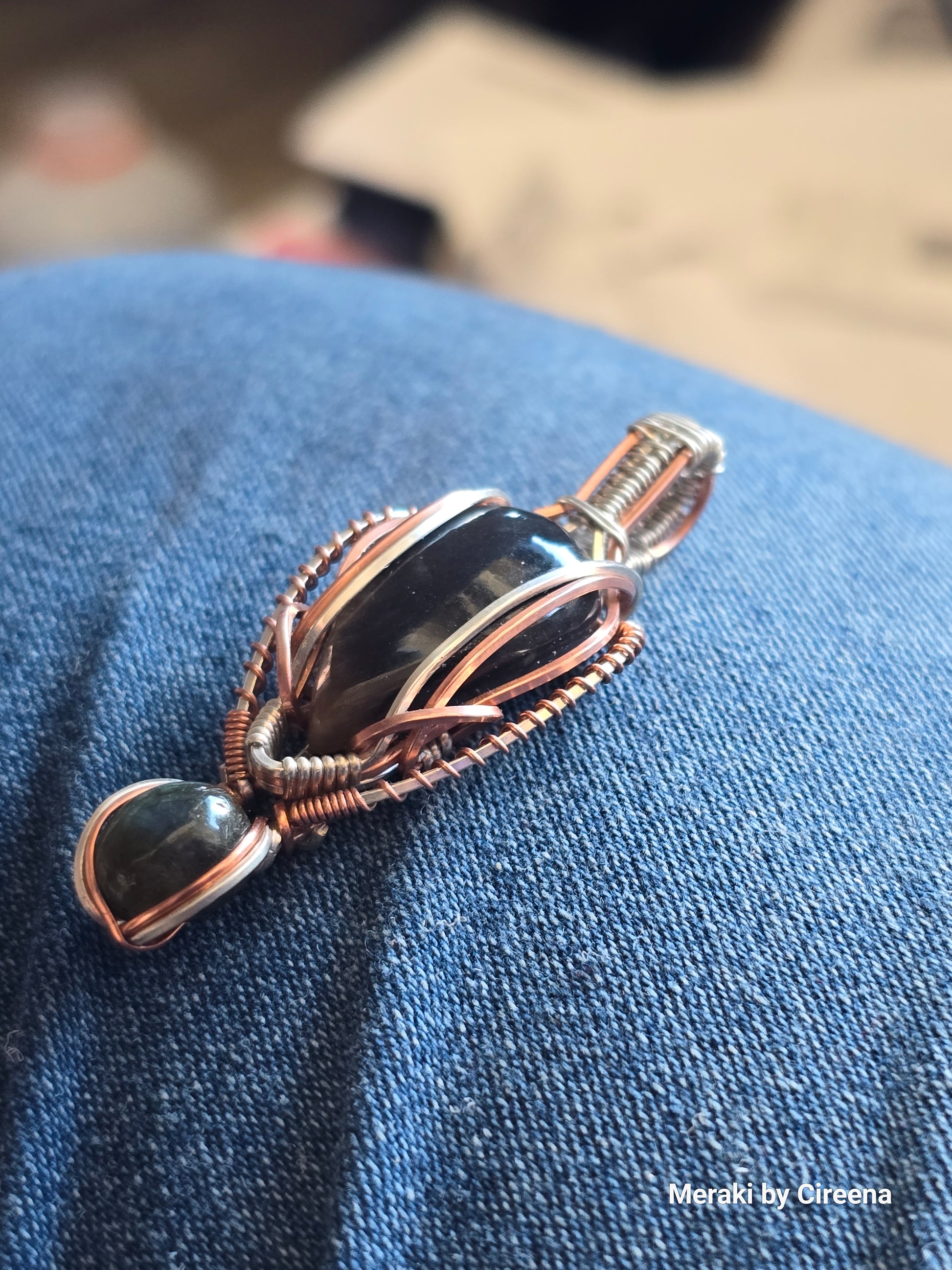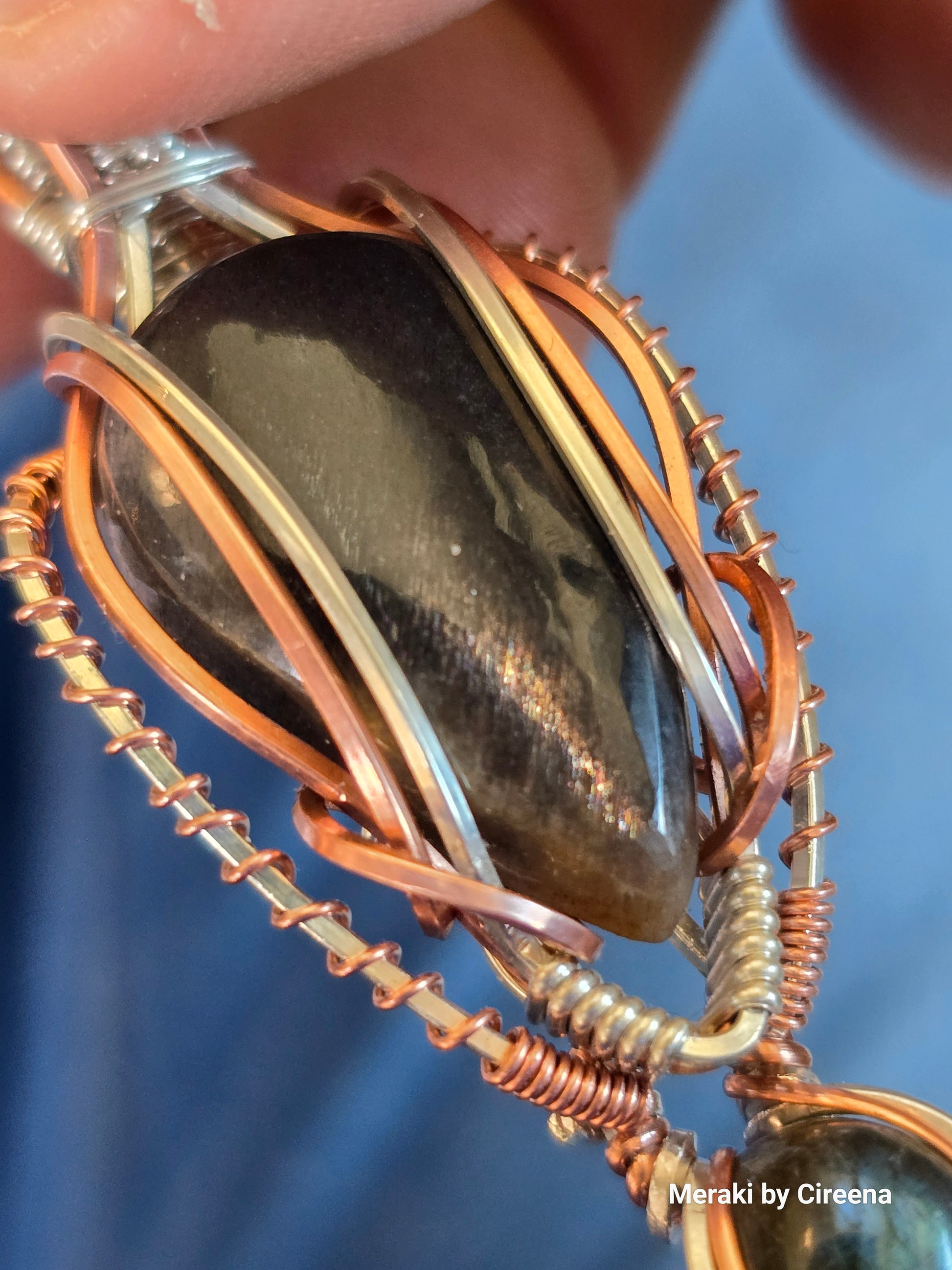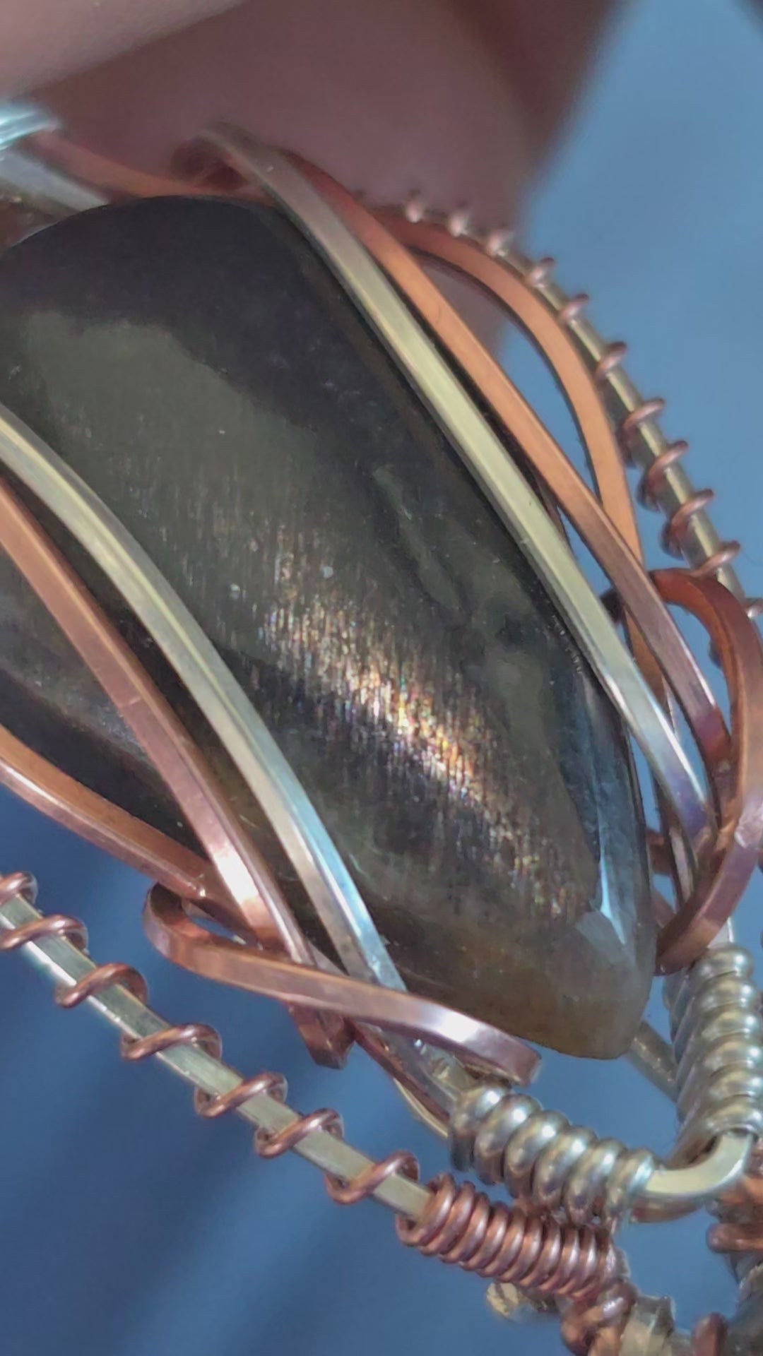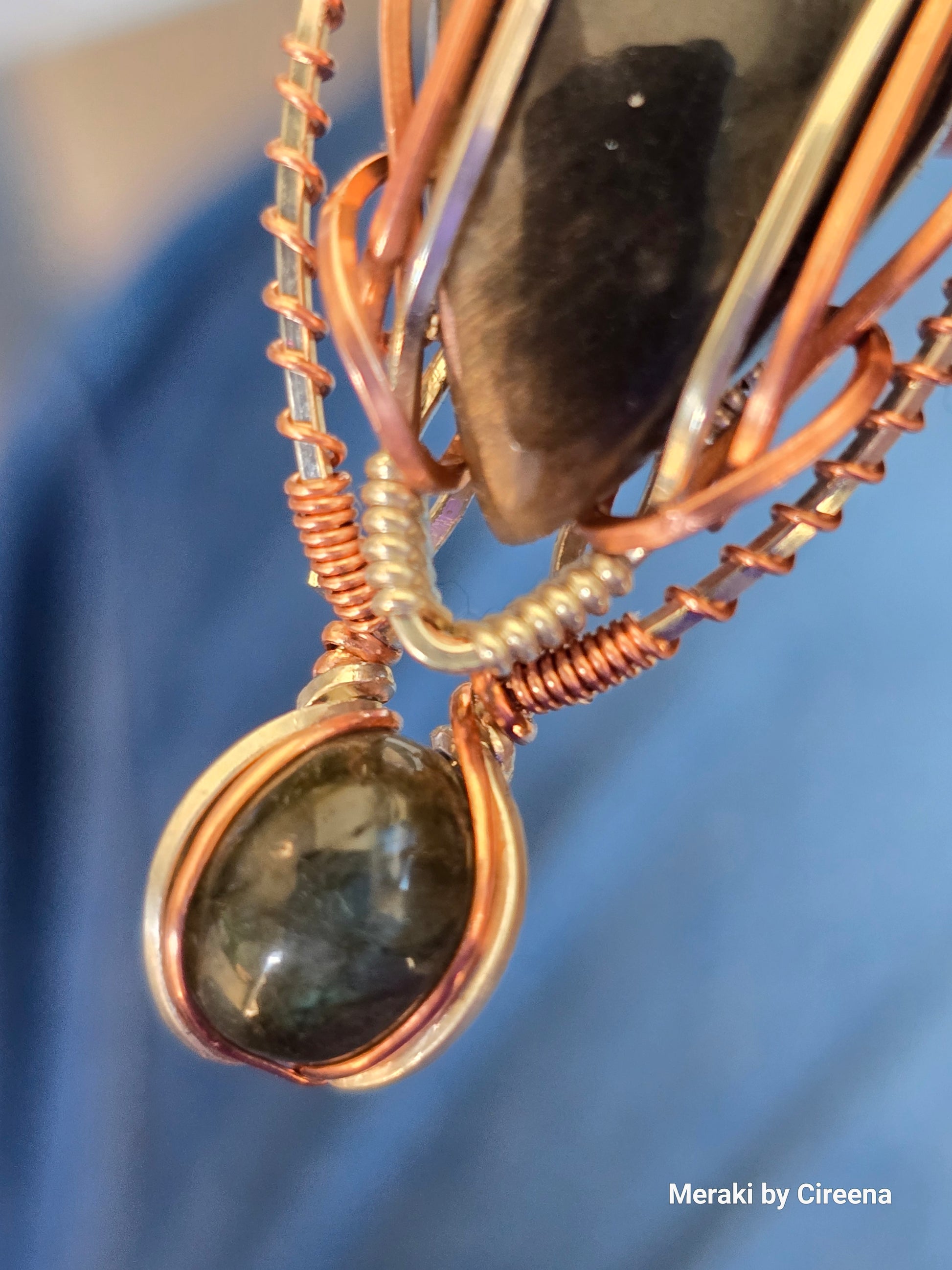 Sparkle with celestial beauty wearing our "Eclipse of the Sun"stone Silver & Copper Pendant. Handcrafted in copper and sterling silver, this pendant features stunning black Rainbow Sunstone and Labradorite gemstones. Radiate elegance and charm with this unique blend of metals and gemstones.